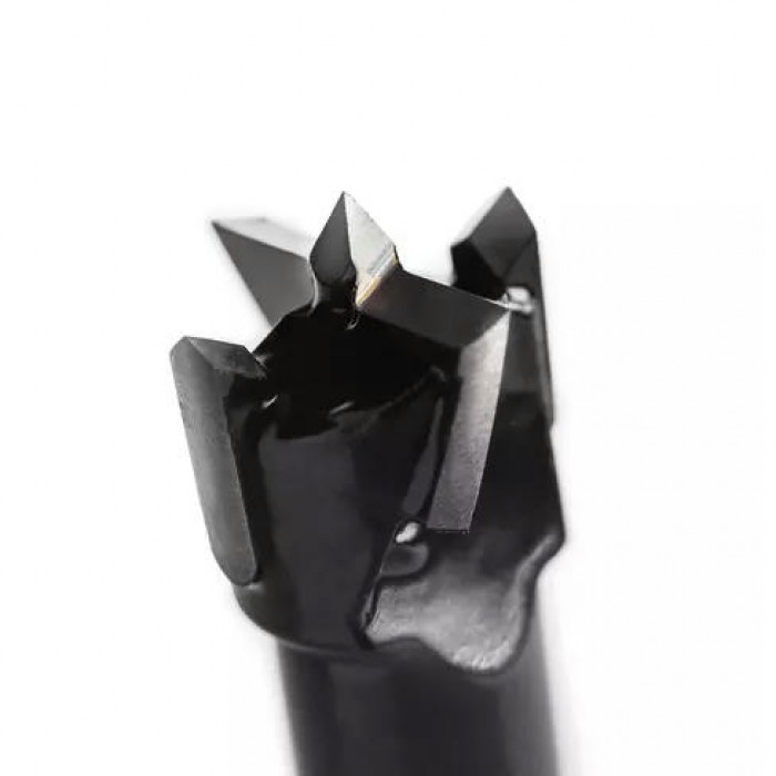 Острые боковые резцы (Z2), режущие кромки (+V2) и короткое центрирующее острие выполнены из карбида вольфрама (TCT, твердость 90-92 HRA), что обеспечивает повышенную стойкость сверла, в том числе при обработке твердых пород древесины.