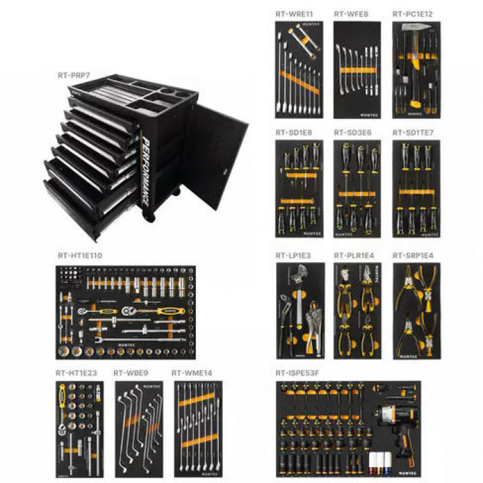 Инструментальная тележка RUNTEC PERFORMANCE с 7 выдвижными полками является идеальным решением для специалистов автосервисов. Набор из 273 предметов располагается в ложементах, которые идеально помещаются на полках. Столешница тележки изготовлена из износостойкого ABS пластика с расположенными на ней пластиковыми отделениями для инструмента или оснастки. Порошковая окраска защищает от коррозии и механических повреждений.