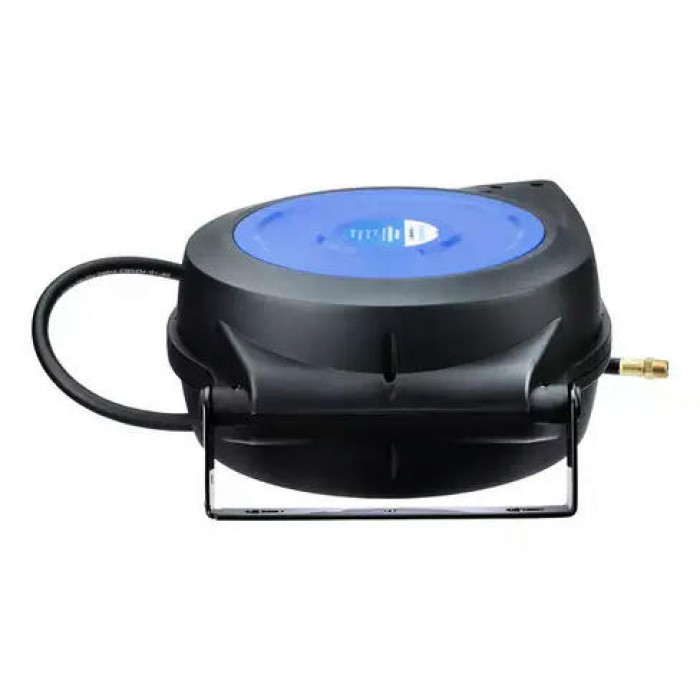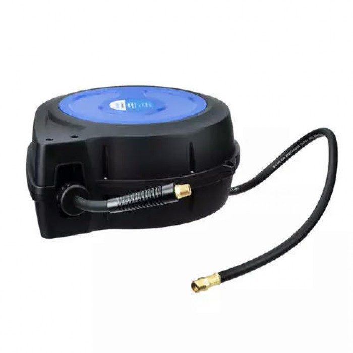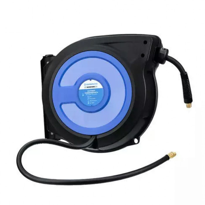 Катушка пневмошланга Garwin GE-RH1009 в пластиковом корпусе. Длина шланга - 10 м. Внутренний диаметр шланга - 10 мм. Диаметр внешней резьбы на вход и на выход - 3/8 дюйма.