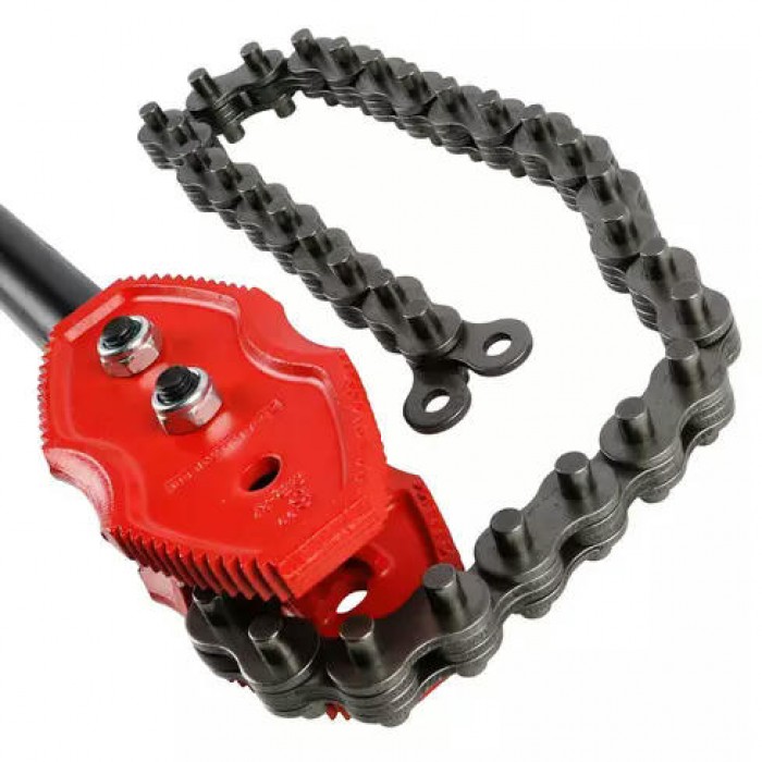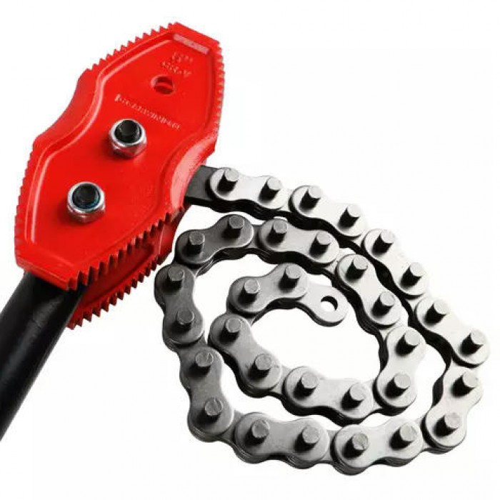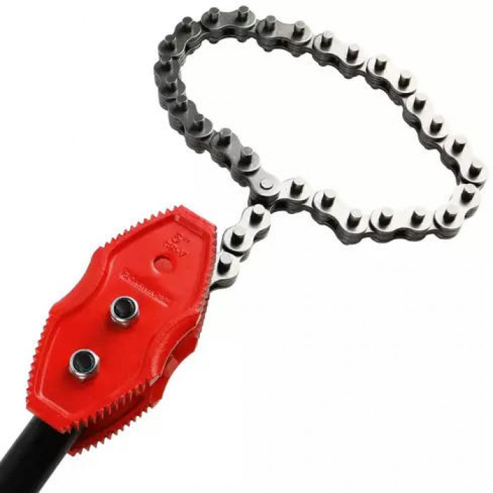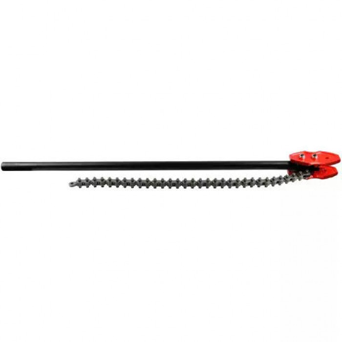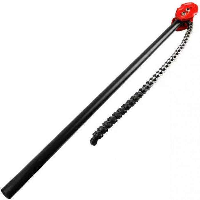 Позволяет работать в условиях, где использование стандартного разводного ключа или иного шарнирно-губцевого инструмента невозможно. Длина цепи 897 мм.