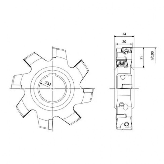 Корпус фрезы дисковой с диаметром 100 мм, посадочным диаметром 25 мм, количеством зубьев 8 и углом в плане 90 градусов.