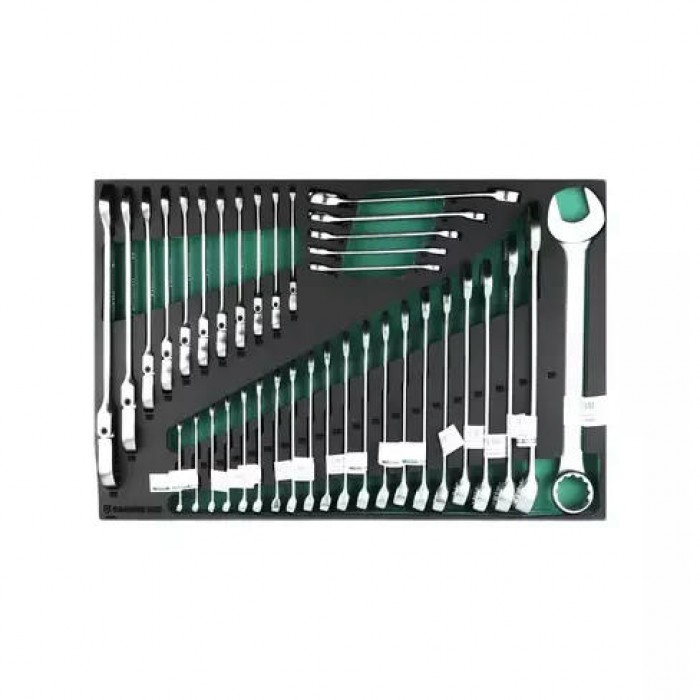 Поверхность ключей защищена никель-хромовым гальваническим покрытием для предотвращения коррозии. Органайзер из эластичного каучука EVA надежно фиксирует инструменты, обеспечивая удобное хранение и быстрый доступ. Набор предназначен для автосервисов, производственных и монтажных работ.