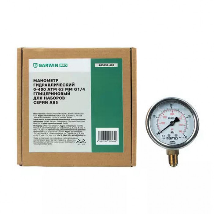 Манометр гидравлический A85650-400 GARWIN PRO 0-400 атм 63 мм G1/4 глицериновый для наборов серии A85 подходит для использования в качестве запасной части к наборам GARWIN PRO A85530, A85540, A85530, а также к гидравлическим прессам.