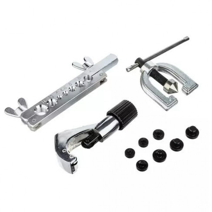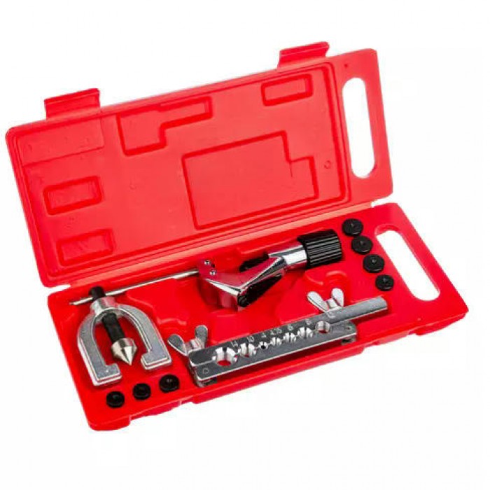 Набор инструментов для резки и развальцовки метрических трубок SPECX A04510 предназначен для односторонней и двусторонней развальцовки трубок непосредственно на автомобиле Применим для медных, латунных и алюминиевых трубок. Эти инструменты могут быть использованы для ремонта автомобилей, мотоциклов, а также в других областях, где требуется работа с трубками. В комплекте пуансоны (штампы, грибки) для развальцовки размерами 4; 4,75; 6; 8; 10; 12; 14 мм.
