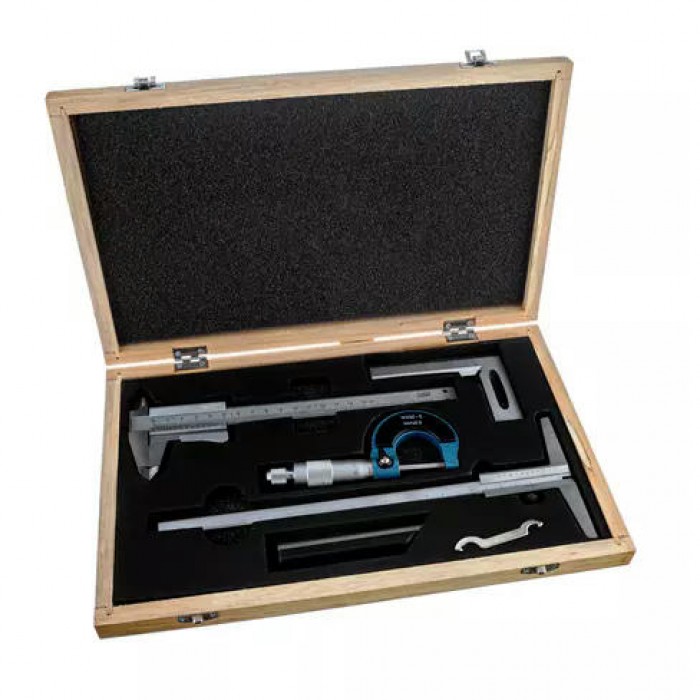 Комплект профессиональных измерительных инструментов: штангенциркуль 150 мм (точность 0,05 мм), угломер, щуп, глубиномер и линейка. Нержавеющая сталь. Ударопрочный кейс. Для слесарных и столярных работ.
