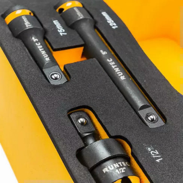 Набор с пневмогайковертом, шестигранными ударными головками и аксессуарами, изготовленными из высококачественной закаленной хромомолибденовой стали CrMo, устойчивой к высоким ударным нагрузкам с оптимальным сочетанием твердости и ударной вязкости для интенсивной эксплуатации в тяжелых условиях.