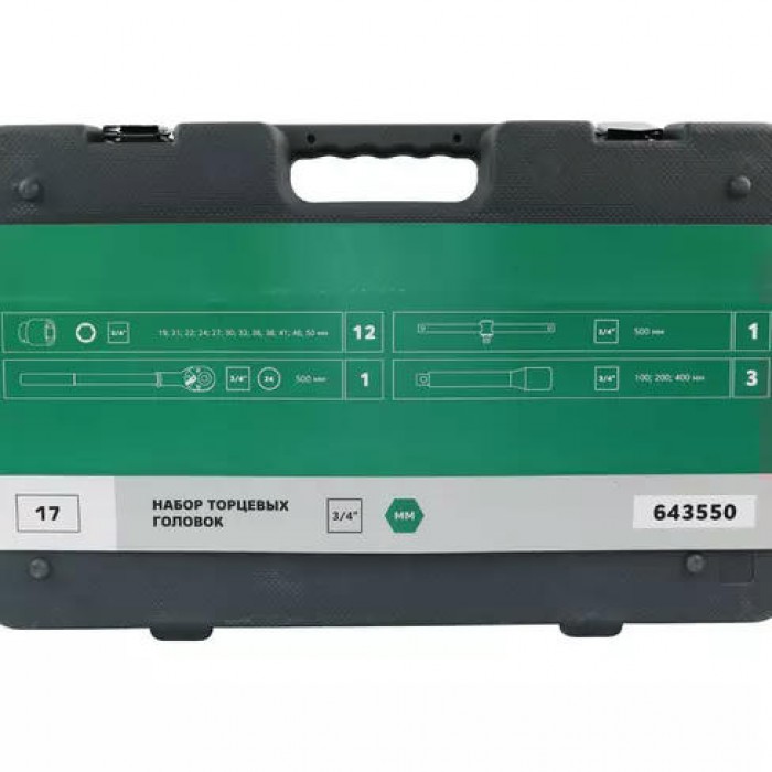 Головки торцевые 6 граней с приводом 3/4”: 19; 21; 22; 24; 27; 30; 32; 36; 38; 41; 46; 50 мм | 12 шт. | |