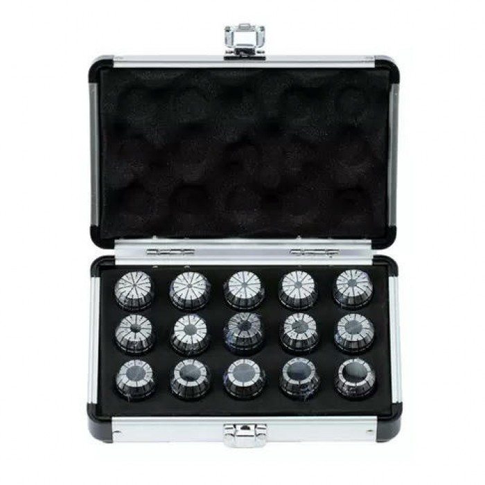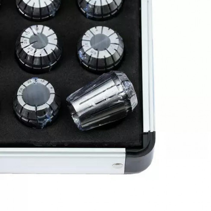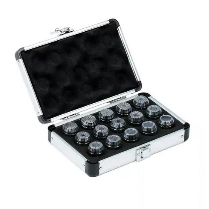 Набор цанг ER25 без внутреннего подвода СОЖ, 15 предметов в металлическом кейсе, стандартной точности ≤0,015. В комплекте 15 цанг ER25, диаметр хвостовика от 2 до 16 мм. Набор предназначен для фиксации фрез, сверл и другого инструмента с цилиндрическим хвостовиком по стандарту DIN 6499. Сквозное отверстие, две зоны зажима. Цанги типа ER зажимаются в соответствующих фрезерных патронах, как с хвостовиком Морзе, так и конусах SK, BT, NT, а также в оправках с цилиндрическим хвостовиком.