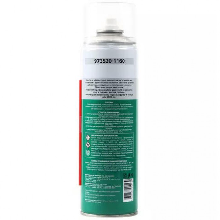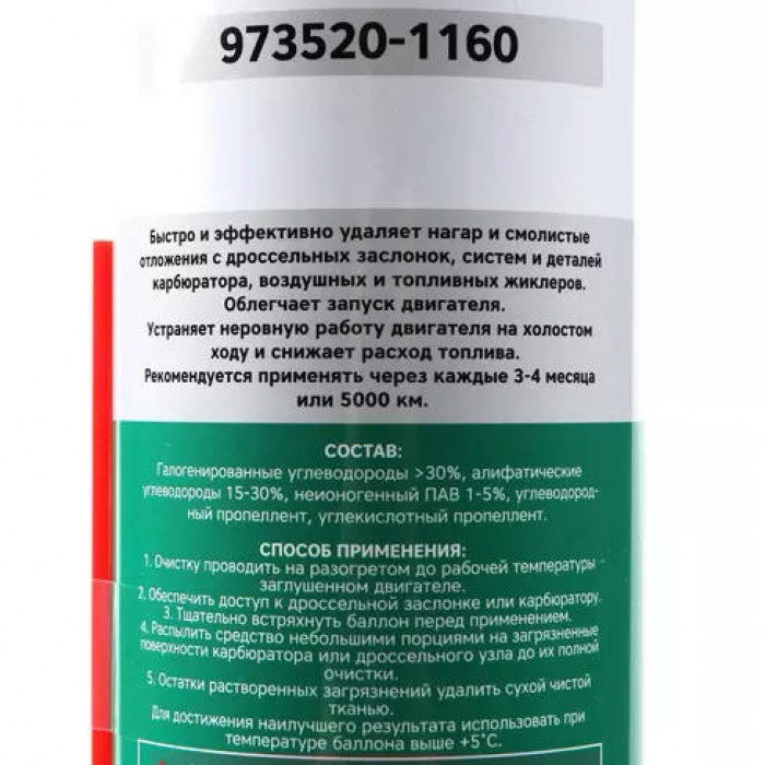 Предназначен для быстрой и эффективной очистки дроссельных заслонок от любых загрязнений, в том числе и бензиновых пленок с внутренней поверхности карбюратора двигателя автомобиля. Рекомендуется во время ремонта карбюратора для очистки внутренних деталей.