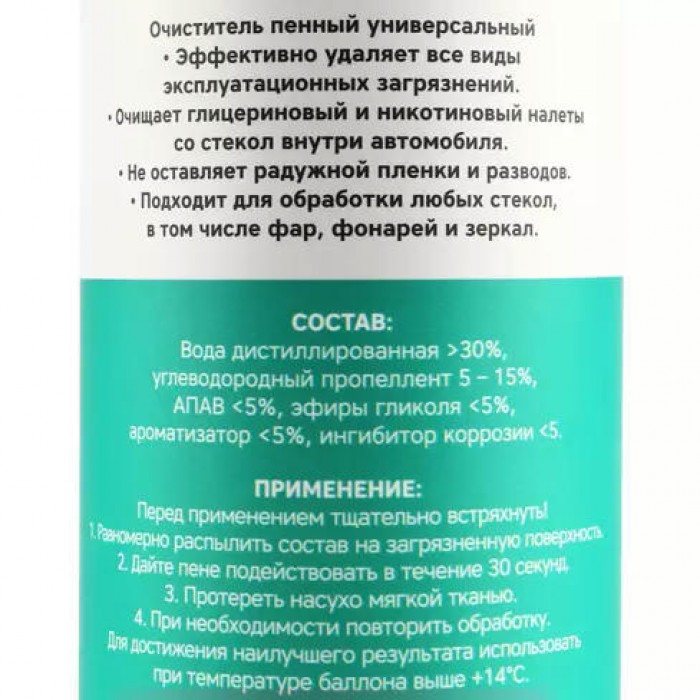 Очиститель пенный универсальный эффективно удаляет все виды эксплуатационных загрязнений.Очищает глицериновый и никотиновый налет со стекол внутри автомобиля.Не оставляет радужной пленки и разводов.Подходит для обработки любых стекол, в том числе фар, фанарей и зеркал.