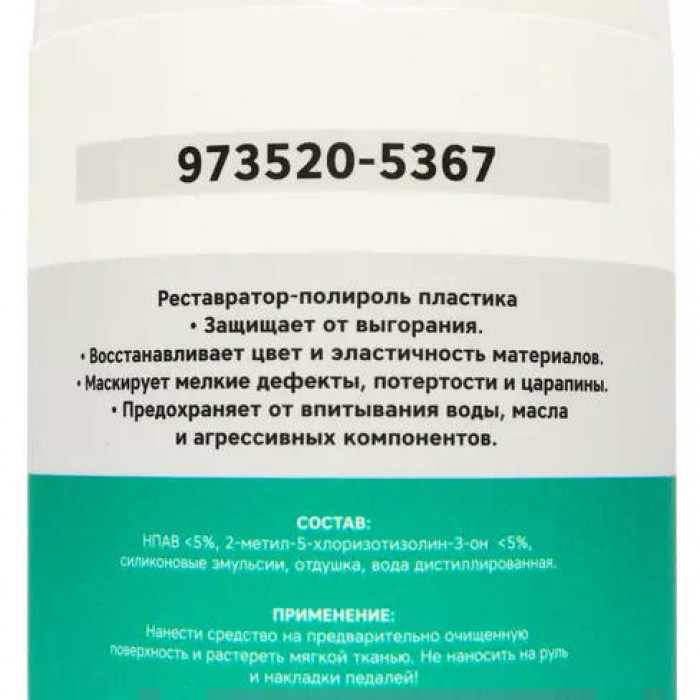 Реставратор-полироль пластика GARWIN PRO защизает от выгорания, восстанавливает цвет и эластичность материалов. Средство маскирует мелкие дефекты, потертости и царапины, а также предохраняет от впитывания воды, масла и агрессивных компонентов.