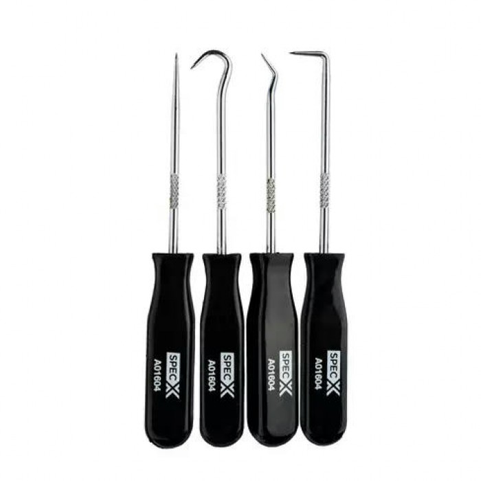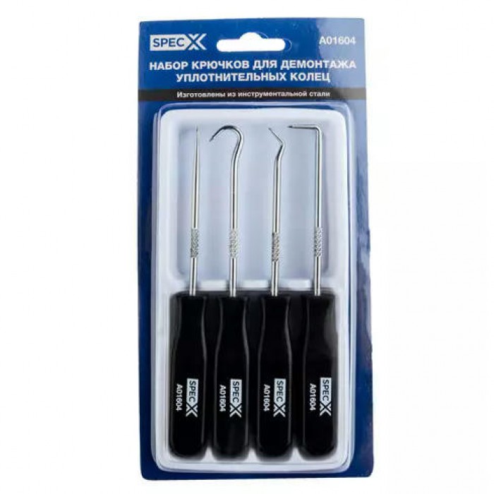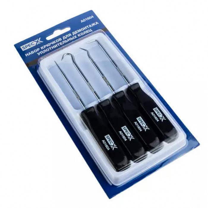 Набор крючков для демонтажа уплотнительных колец SPECX A01604 позволяет быстро и без усилий снимать уплотнительные кольца, отделять шайбы, разделять провода и проводить иные мелкие работы. Этот набор крючков предназначен для быстрого и аккуратного демонтажа уплотнительных колец различного диаметра. В комплекте идут четыре крючка разной формы и размера, что позволяет подобрать наиболее подходящий инструмент для каждого конкретного случая.