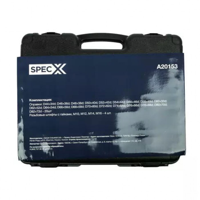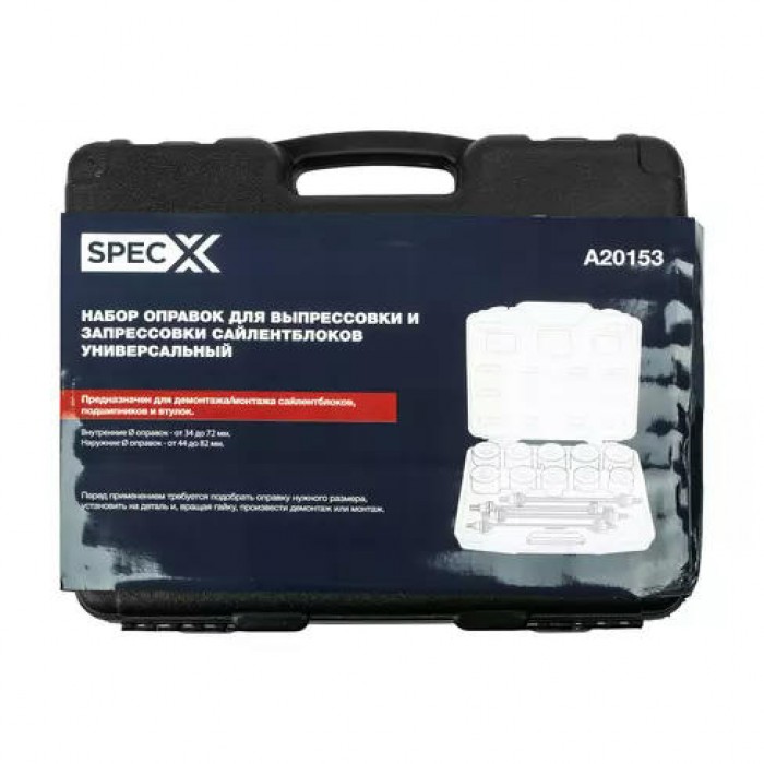 Универсальный набор оправок для запрессовки и выпрессовки сайлентблоков SPECX A20153. Предназначен для демонтажа и установки сайлентблоков, подшипников и втулок. Диаметр внутренних оправок - от 34 до 72 мм. Диаметр наружных оправок - от 44 до 82 мм.