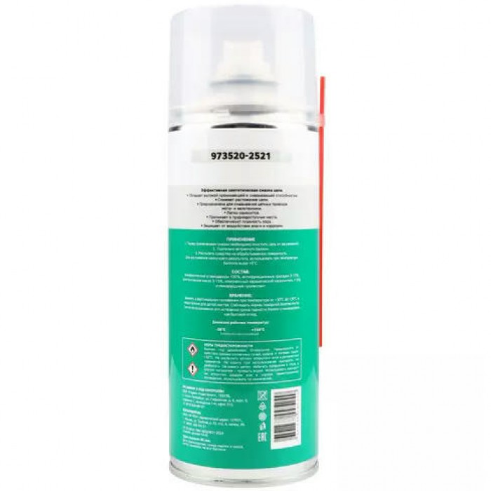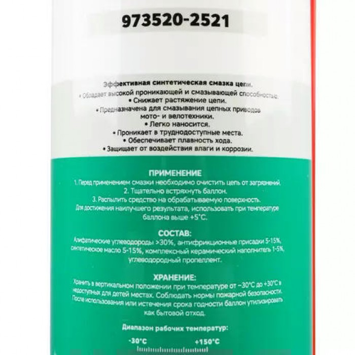 Эффективная синтеическая смазка цепи. Обладает высокой проникающей и смазывающей способностью. Снижает растяжение цепи. Предназначена для смазывания цепных приводов мото- и велотехники. Легко наносится. Проникает в труднодоступные места. Обеспечивает плавность хода. Защищает от воздействия влаги и коррозии.