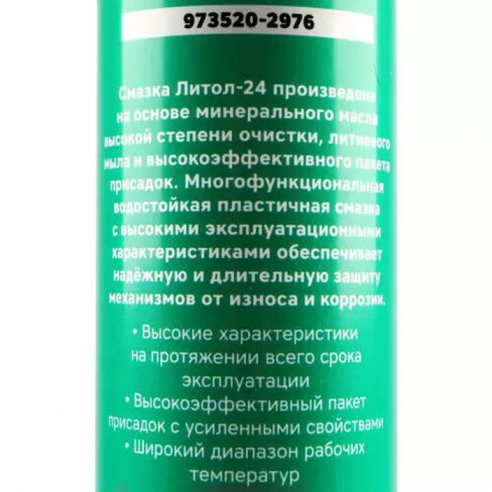 Смазка Литол-24 произведена на основе минирального масла высокой степени очистки, литиевого масла и высокоэффективного пакета присадок. Многофункциональная водойстойкая пластичная смазка с высокими эксплуатационными характеристиками обеспечивает надеждную и длительную защиту механизмов от износа и коррозии.