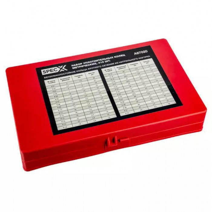 Набор круглых уплотнительных колец метрических, нитрильный каучук, в кейсе, 419 шт A87020 SPECX - практичный набор из 419 резиновых уплотнительных колец. Уплотнительные кольца изготовлены из резины, устойчивой к воздействию агрессивных факторов, таких как топливо, масла и химикаты, высокая температура. Предназначены, прежде всего, для уплотнения подвижных и неподвижных гидравлических, пневматических, топливных и смазочных узлов механизма. Набор поставляется в удобном и прочном пластиковом кейсе с отделениями обеспечивающими порядок.
