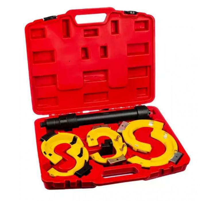 Стяжка пружин универсальная 62-215 мм для подвески Макферсон, усилие 1 т, c защитными накладками SPECX A20055 представляет собой комплект многофункциональных инструментов для ремонта автомобильных подвесок типа Macpherson. Предназначено для сжатия и фиксации пружины подвески с амортизационной стойкой. В комплект входят 3 пары взаимозаменяемых захватов с защитными пластиковыми накладками для предотвращения повреждения пружин.