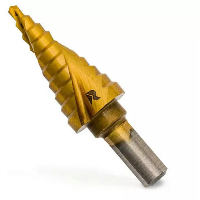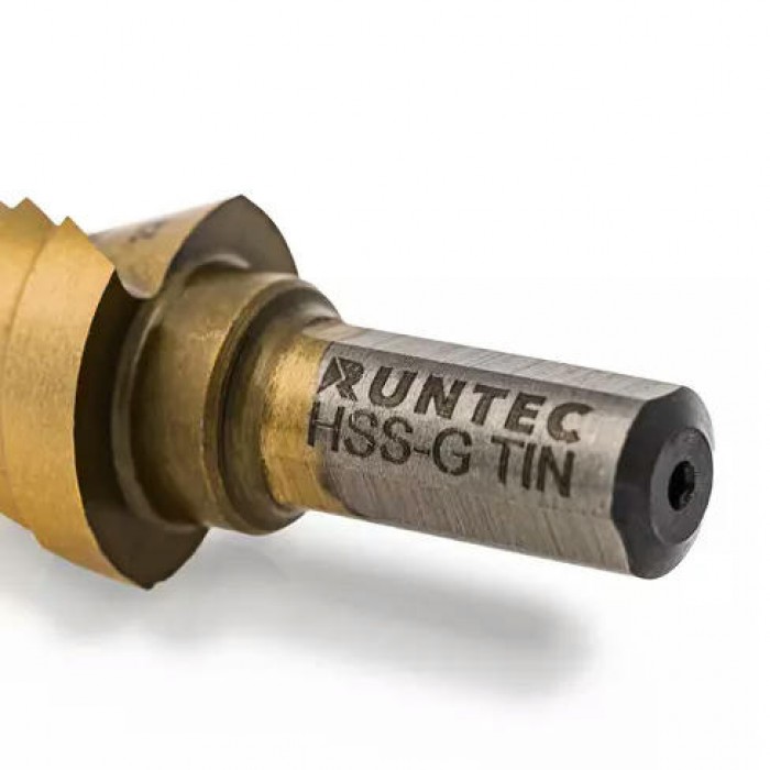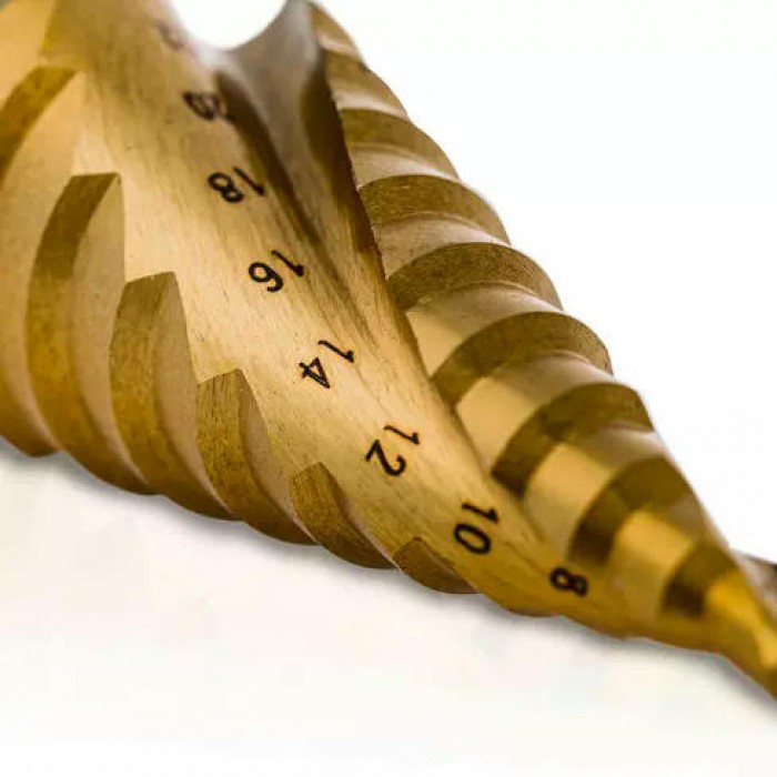 Ступенчатое сверло подходит для сверления листовой стали толщиной до 4 мм и прочностью до 900 Н/мм², цветных металлов, а также твердого пластика. Изготовлено из быстрорежущей стали HSS-G (Р6М5), которая отличается прочностью и долговечностью. Покрытие нитридом титана (TiN) увеличивает срок службы, снижая нагрев при сверлении и повышая поверхностную твердость сверла.
