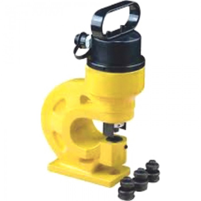 Устройство состоит из корпуса, гидроцилиндра, быстроразъемного соединения (БРС) и ручки для переноса. Корпус выполнен в виде станины с опорной плитой. Сменные матрицы устанавливаются в посадочное отверстие в корпусе и фиксируются винтом. Пуансоны устанавливаются в шток гидроцилиндра и фиксируются гильзой. Быстроразъемное соединение (БРС) позволяет быстро и без потери масла соединять и отсоединять рукав высокого давления. Масло нагнетается в гидроцилиндр и перемещает шток, на котором установлен пуансон. Пуансон и матрица сопрягаются и пробивают отверстие. При сбросе давления пружина возвращает шток в исходное положение.