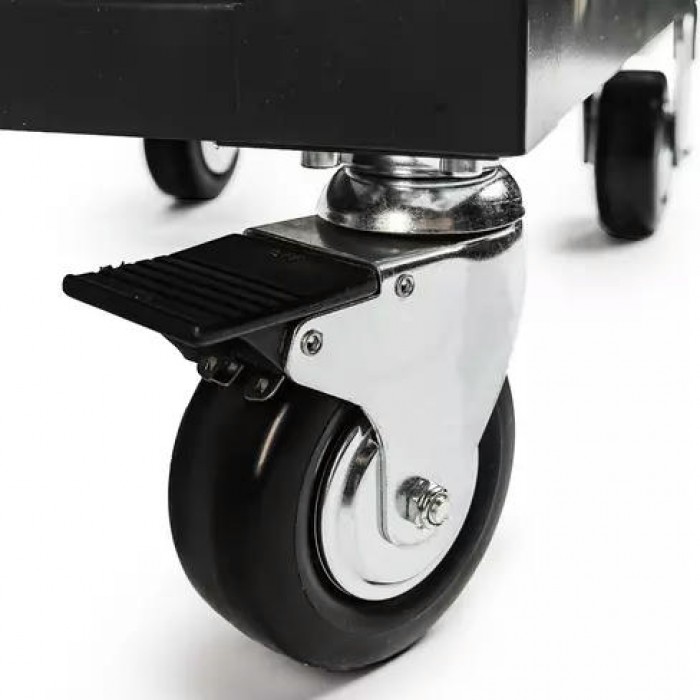 ⠀Выдвижные ящики разного размера для организации инструмента по категориям. Максимальная нагрузка — 400 кг, подходит для тяжёлого оборудования и оснастки. Увеличенные колёса Ø125 мм обеспечивают плавное перемещение даже по неровному полу. Функция блокировки колёс предотвращает самопроизвольное движение тележки при работе.