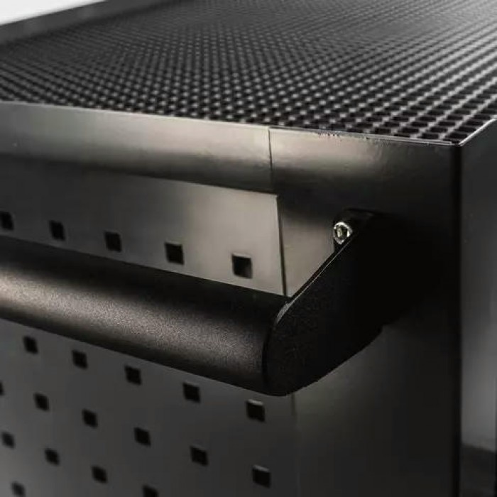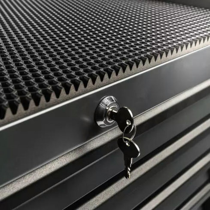 Текстурные ручки ящиков для удобного использования в перчатках. Центральный замок для защиты содержимого от несанкционированного доступа. Толщина металла — 1.2 мм, что гарантирует прочность конструкции и долговечность в условиях интенсивной эксплуатации.