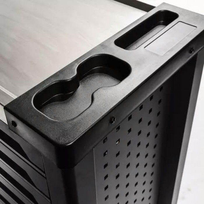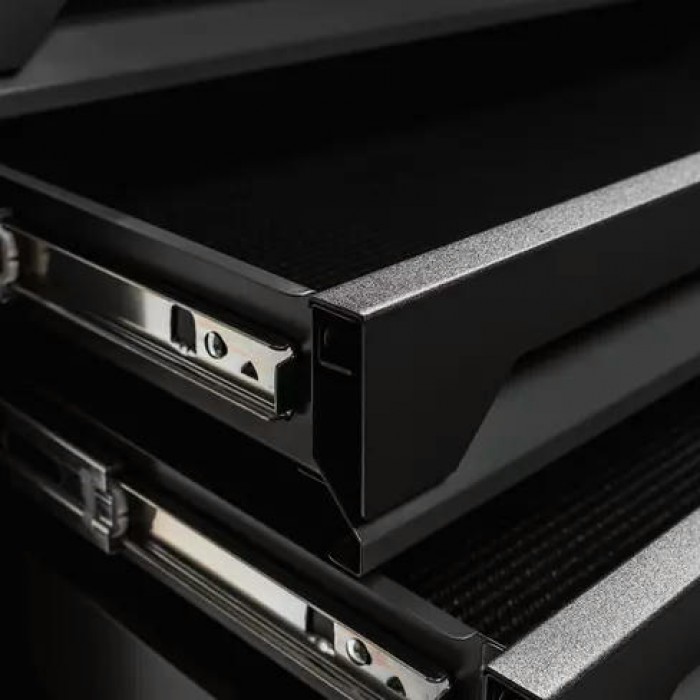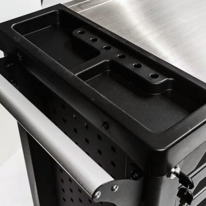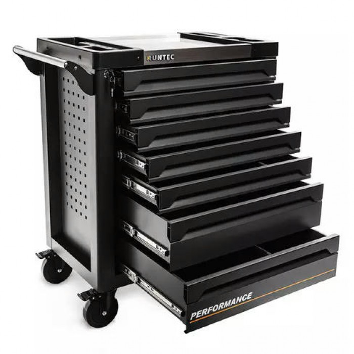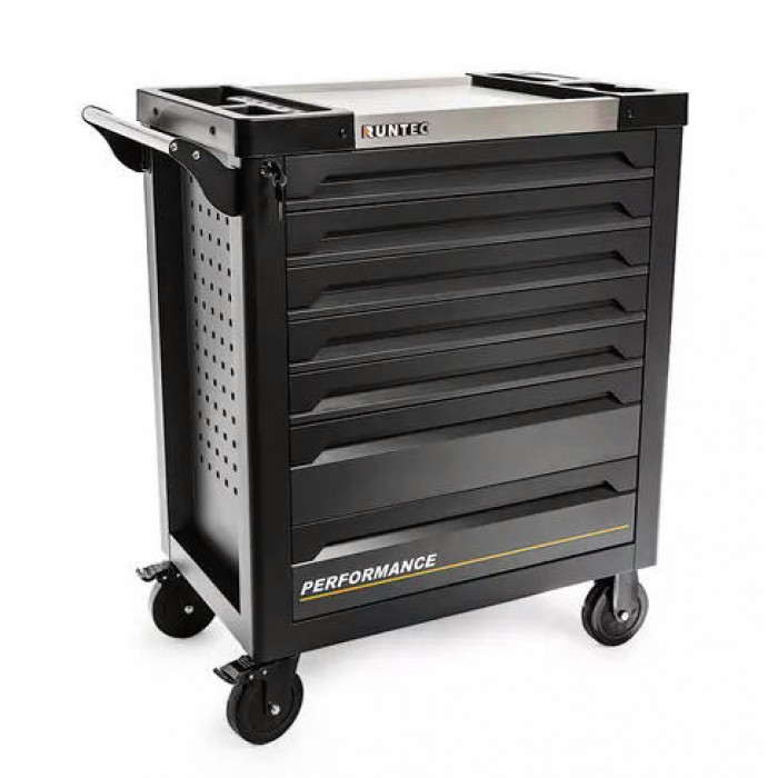 Инструментальная тележка RUNTEC предназначена для профессионального использования в мастерских, автосервисах и на производстве. Оснащена 7 выдвижными ящиками с системой push-to-open, благодаря чему они не откроются при передвижении тележки. Удобная алюминиевая рукоять с анатомически правильной формой и нескользящим 3D-эффектом обеспечивает комфорт при перемещении тележки. Верхняя часть выполнена в виде прочной столешницы с рабочей поверхностью из нержавеющей стали и нишами из ABS-пластика.