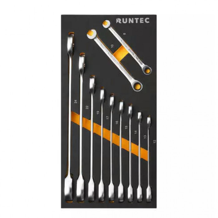 | RT-WRE11 | Набор ключей комбинированных трещоточных RUNTEC CrV 8-24 мм в ложементе EVA, 11 предметов, 185x375x40 мм | |