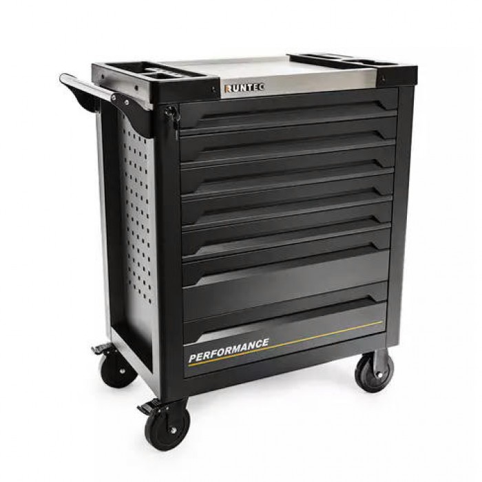 Инструментальная тележка RUNTEC PERFORMANCE с 7 выдвижными полками является идеальным решением для специалистов автосервисов. Набор из 273 предметов располагается в ложементах, которые идеально помещаются на полках. Столешница тележки изготовлена из износостойкой нержавеющей стали, по бокам от нее расположены пластиковые отделения для инструмента или оснастки. Порошковая окраска защищает от коррозии и механических повреждений.