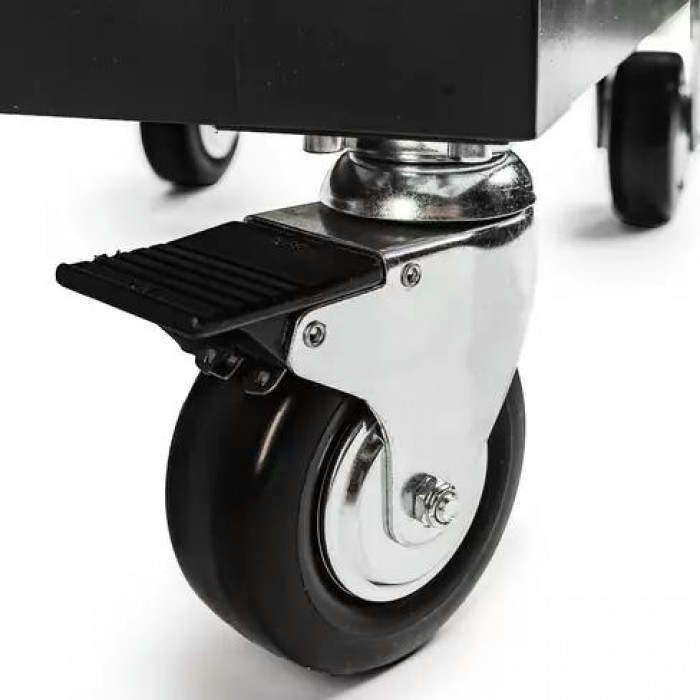 Выдвижные ящики разного размера для организации инструмента по категориям. Максимальная нагрузка — 550 кг, подходит для тяжёлого оборудования и оснастки. Увеличенные колёса Ø125 мм обеспечивают плавное перемещение даже по неровному полу. Функция блокировки колёс предотвращает самопроизвольное движение тележки при работе.