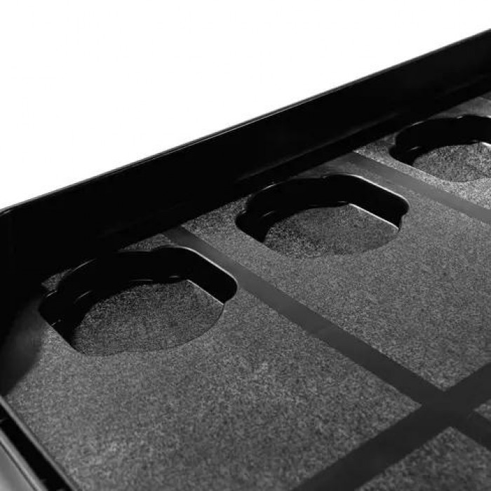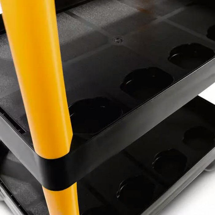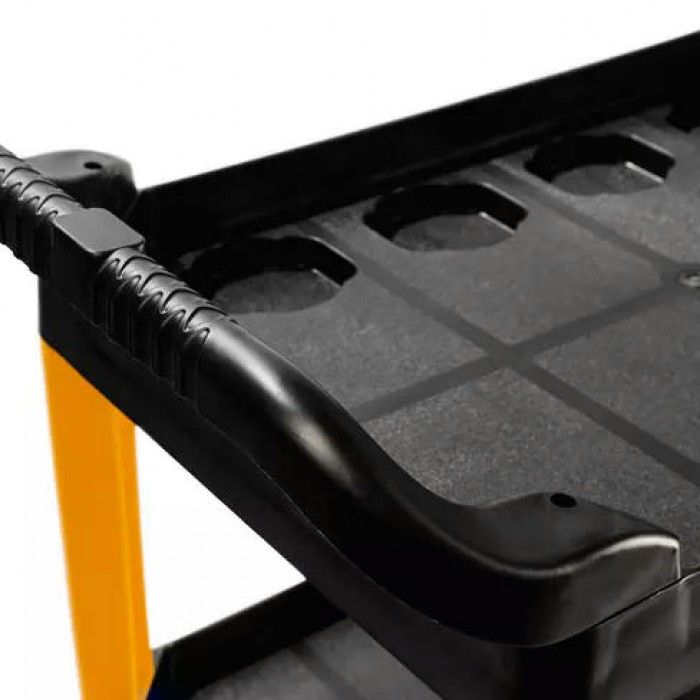 Легкая конструкция из полипропилена оснащена ребрами жесткости. Тележка устойчива к коррозии и механическим повреждениям. Маневренность и устойчивость за счет поворотных колес из резины. 2 рукоятки анатомической формы для удобства перемещения. 12 углублений для хранения мелких деталей и расходных материалов. Максимальная нагрузка на тележку — 200 кг.