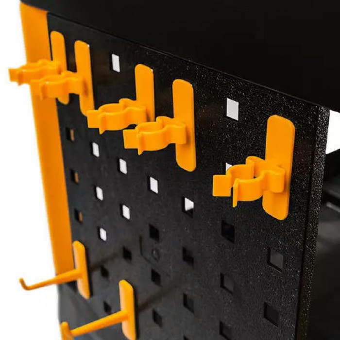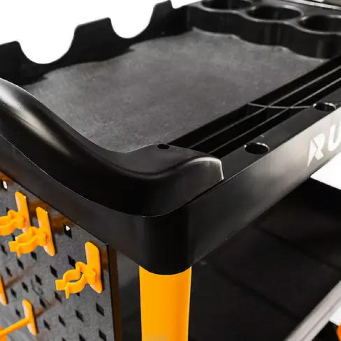 Легкая конструкция из полипропилена оснащена ребрами жесткости. Тележка устойчива к коррозии и механическим повреждениям. Маневренность и устойчивость за счет поворотных колес из резины. 2 рукоятки анатомической формы для удобства перемещения. Подвесной карман, крючки и зажимные держатели позволяют удобно организовать хранение. 12 углублений в полках для хранения мелких деталей и расходных материалов. Максимальная нагрузка на тележку — 200 кг.