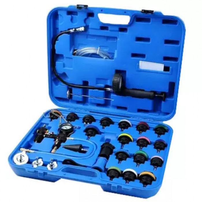 Универсальный тестер систем охлаждения в комплекте с 27 предметами. Позволяет проводить диагностику системы охлаждения автомобиля. Включает все необходимые адаптеры для работы с различными моделями авто. Компактный кейс обеспечивает удобное хранение и транспортировку. Профессиональный инструмент для автосервисов.