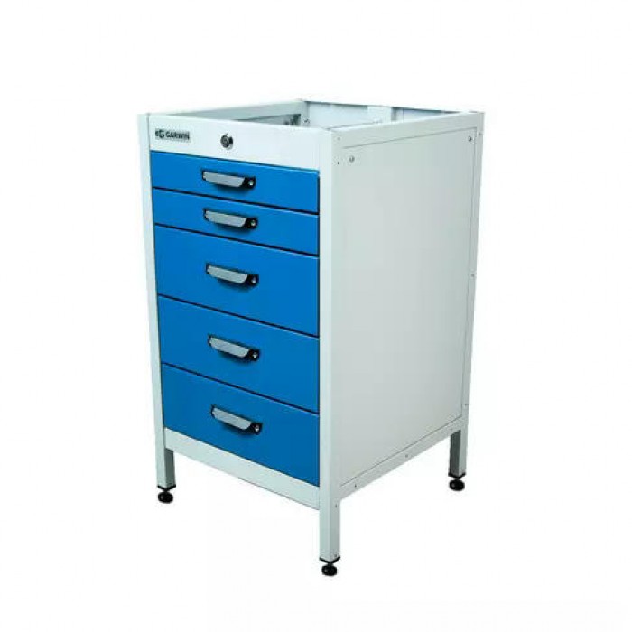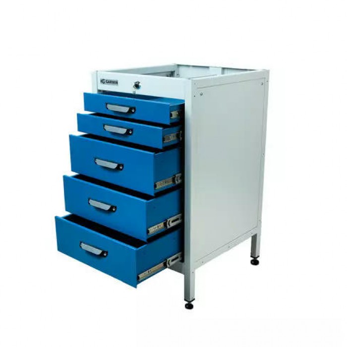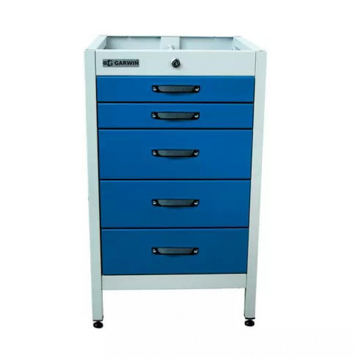 Тумба с пятью ящиками от GARWIN PRO со светло-серым каркасом (RAL7035) и светло-синими ящиками (RAL5015). Тумба изготовлена из высокопрочной стали и устойчива к коррозии и механическим воздействиям, что гарантирует долгий срок службы. Ее легко чистить, а пять ящиков обеспечивают удобный доступ к хранящимся инструментам и рабочим принадлежностям.