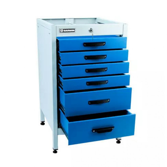 Тумба GARWIN PRO с шестью выдвижными ящиками. Её каркас выполнен в светло сером цвете RAL7035, а ящики в синем цвете RAL5005. Тумба изготовлена из прочной стали, которая не подвержена коррозии. Благодаря этому она прослужит вам долго. Также она легко чиститься.