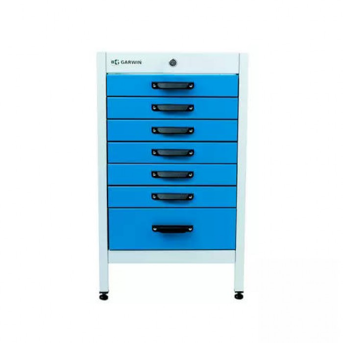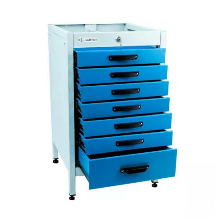 Тумба со светло-серым каркасом RAL7035 и светло-синими выдвижными ящиками RAL5015 от GARWIN PRO. Содержит семь ящиков для удобного доступа к инструментам и рабочим принадлежностям. Тумба изготовлена из высокопрочной стали для длительного срока службы и устойчивости к коррозии и механическим нагрузкам.